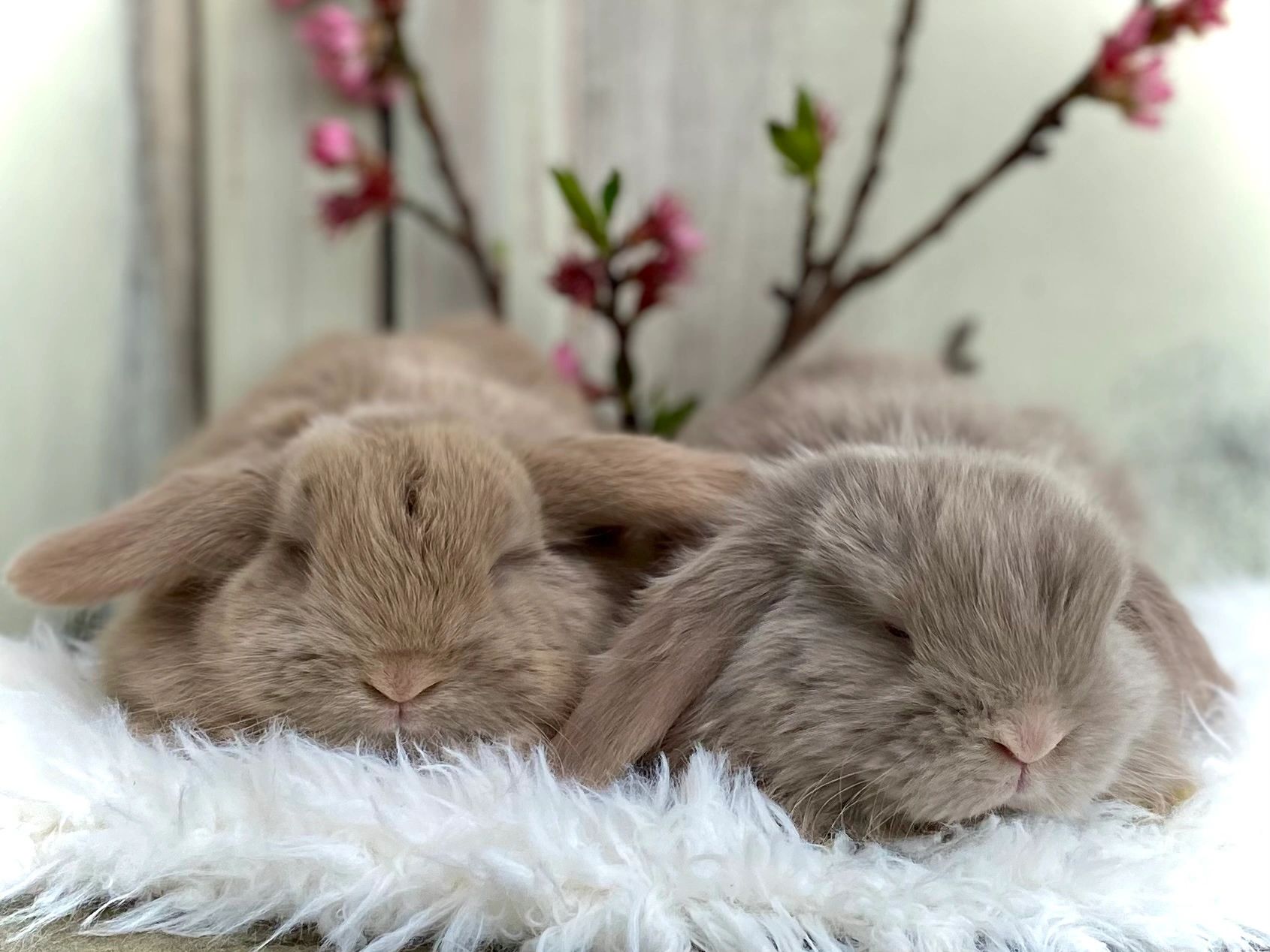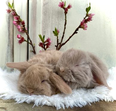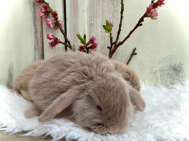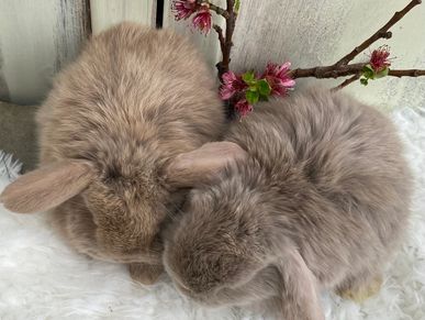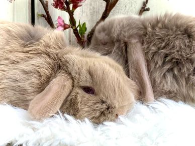 Currently we have a buck and doe Lutino colored babies (pictured) from two different sets of parents. We also have black and chocolate littermates which are Lutino gene carriers.